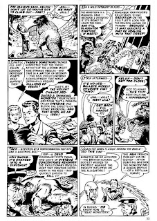 This year I've chosen "Million-Year Monster," which originally appeared in Forbidden Worlds #14 in 1953. I've scanned it from its appearance in a black-and-white magazine, Shock, volume 1 number 3, from 1969. Here's the cover of Forbidden Worlds by artist Ken Bald, where the story was so highly thought of it got the pole position. Note the red dinosaur with a man's face, note the Shemp Howard hairstyle. Note the atom bomb cloud surrounding the monster and a lone soldier shooting.