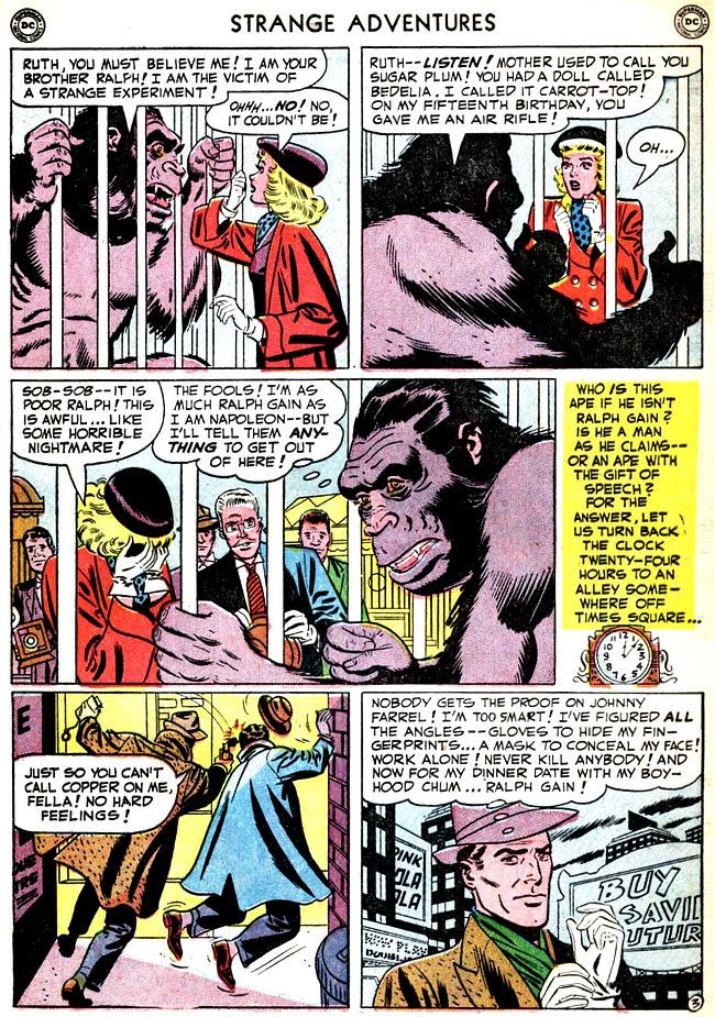 I have three stories for you today: From DC's Strange Adventures #8, 1951, a tale of evolution* by Gardner Fox, illustrated by Bob Oksner and Bernard Sachs. Moving forward along the evolutionary scale we have Nick Cardy's drawing on "Experiment 1000" from House of Secrets #6, 1957. We swing from the branches, away from the DC experimental lab to the Gold Key jungle and a 1964 Boris Karloff tale, starring the Great Man himself, Karloff! chasing after the great white ape in "The Mystagogue." The art is by Frank Thorne.