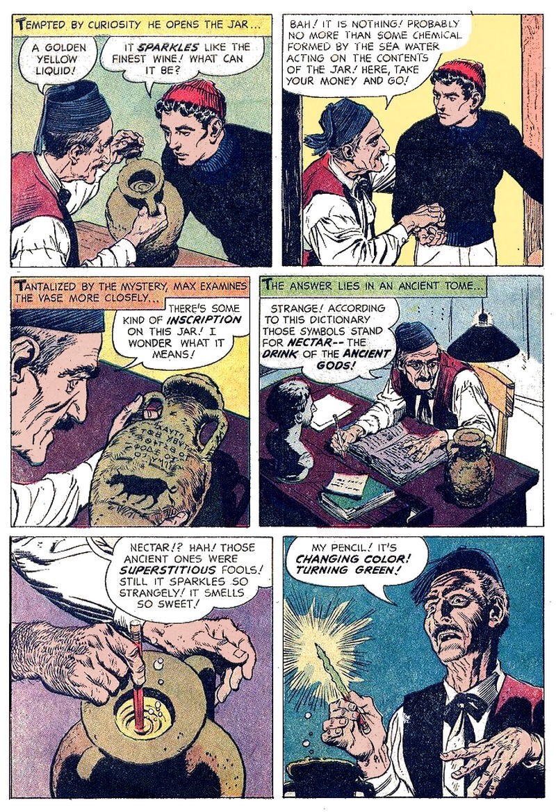 The first issue of the comic book version of the popular TV show, The Twilight Zone, came out in 1961. The entire issue was blessed by the artwork of two top comic book artists, Reed Crandall and George Evans. This shows them at the tops of their form, Crandall penciling and Evans inking. Both had years of experience behind them, and both spent a few years at the ne plus ultra of comics, EC.