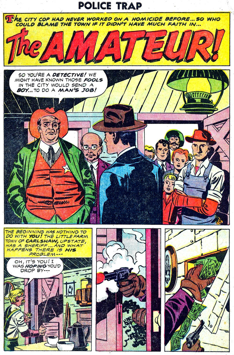 Police Trap was a Simon and Kirby comic, from their Mainline Publishing. Issue #1 came out in 1954; there were four issues under the Mainline imprint and when Mainline folded the title was sold to Charlton. They published two issues. Issue #6, which I'm showing here, was all Kirby. Unlike earlier issues, #6 was produced under the newly instituted Comics Code, and shows it.