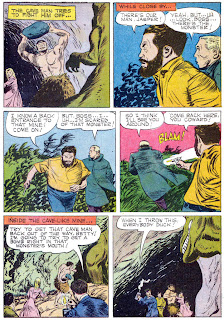 Dell Four Color #1120, Dinosaurus!, from 1960, is a Jesse Marsh job. He did the drawing and lettering.** It's tragic, a guy and a drawing board, so isolated he was dead for several days before his body was found. Some of the artwork in Dinosaurus is rushed, but even so his composition is solid. Despite his problems Marsh was still a professional.