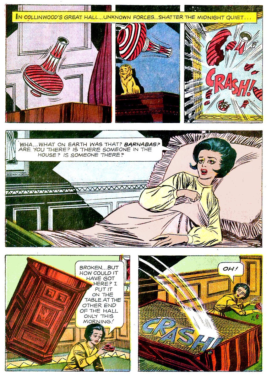 I don’t believe Certa used photo references for the characters. They look enough like them, I guess, to satisfy whomever was in charge of licensing the comic. Jonathan Frid (Barnabas) was a tall and distinguished actor, and in places in the comic he is drawn curiously stunted and out of proportion.