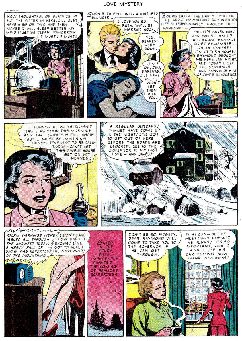 And despite some overcooked dialogue and twice-baked descriptions (“The howling wind sang a dirge to the shivering pair...”) in “The Terror of Tarn House” I enjoyed this story from Fawcett’s Love Mystery #1 (1950). I thought it could have made a movie from that era, and the excellent art by Evans would make a good storyboard. A man falsely accused fits right into a Hitchcock style.